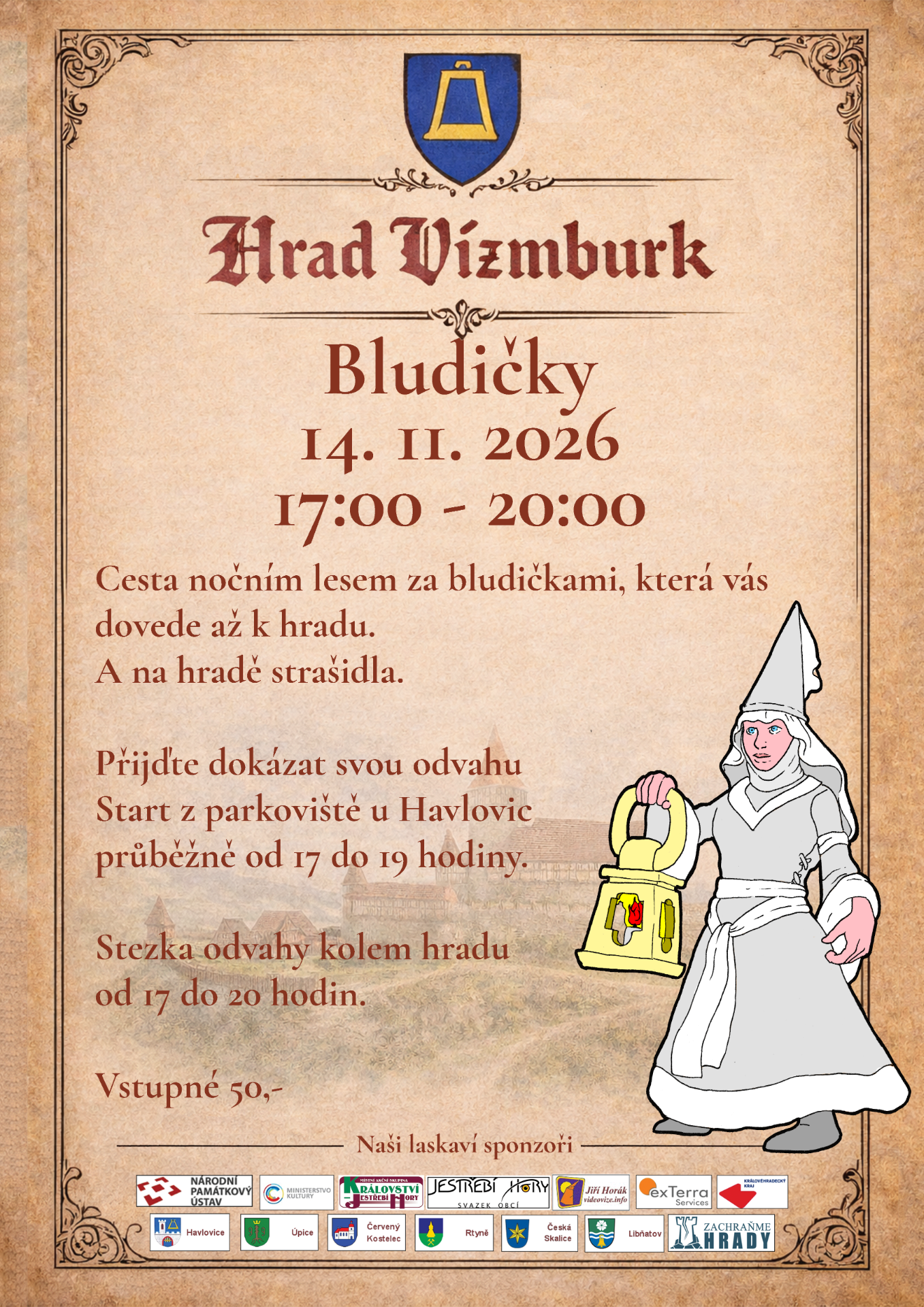 Cesta nočním lesem za bludičkami, která vás dovede až k hradu. A na hradě strašidla. Přijďte dokázat svou odvahu. Start z parkoviště u Havlovic průběžně od 17 do 19 hodiny.